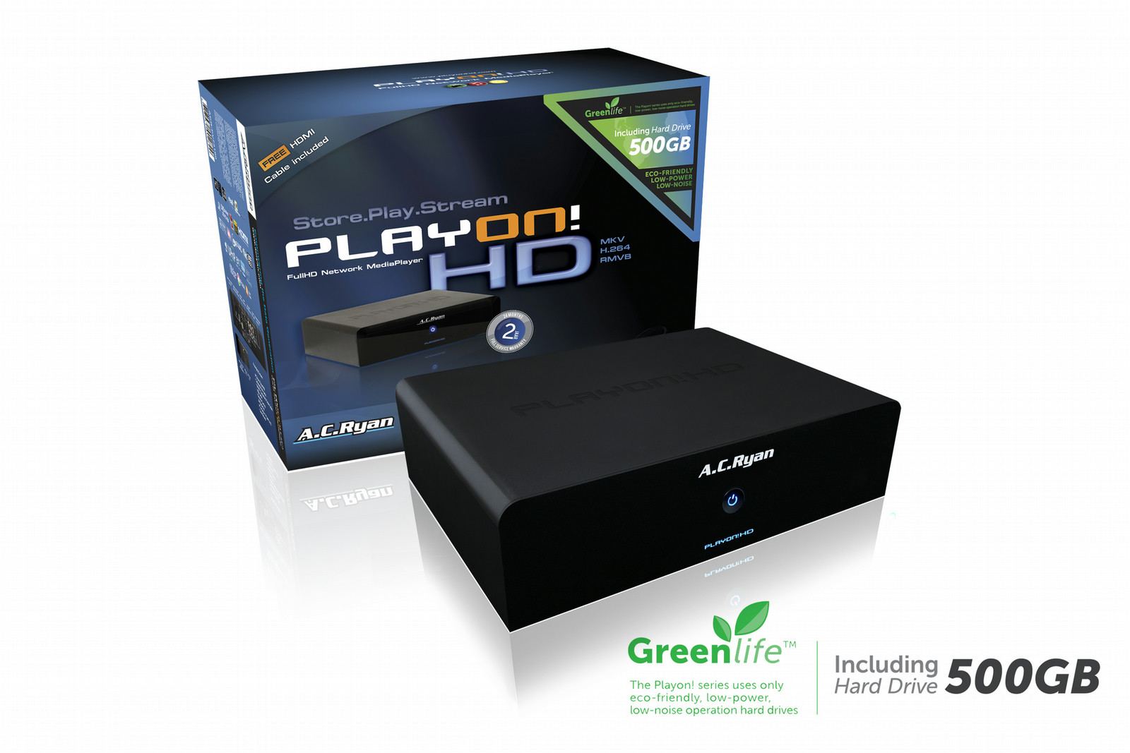 AC Ryan Playon!HD 500GB Full HD Network Media Player. Цвет товара: Черный. Поддерживаемые файловые системы: NTFS, Максимальная емкость накопителей: 0,5 ТБ, Совместимые карты памяти: Memory Stick (MS), MMC, MS PRO, SD, SDHC. Поддерживаемые форматы изображения: BMP,GIF,JPG,PNG,TIF, Форматы звукозаписи: MP3/MP2/WMA/AAC/FLAC/WAV/OGG Vorbis/PCM/LPCM/MS-ADPCM/LC-AAC/HE-AAC/COOK. Алгоритмы шифрования данных: WPA, Характеристики сети: Fast Ethernet, Скорость Wi-Fi (макс): 300 Мбит/с. Вес: 1,6 кг, Размеры (ШхГхВ): 227 x 165 x 60 мм