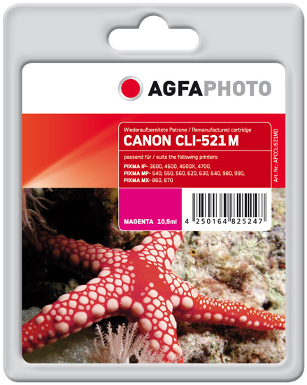 AgfaPhoto APCCLI521MD. Цвета печати: Маджента, Совместимые продукты: PIXMA iP3600, 4600, 4600X, 4700, PIXMA MP540, 550, 560, 620, 630, 640, 980, 990, PIXMA MX860, 870, Технология печати: Струйный