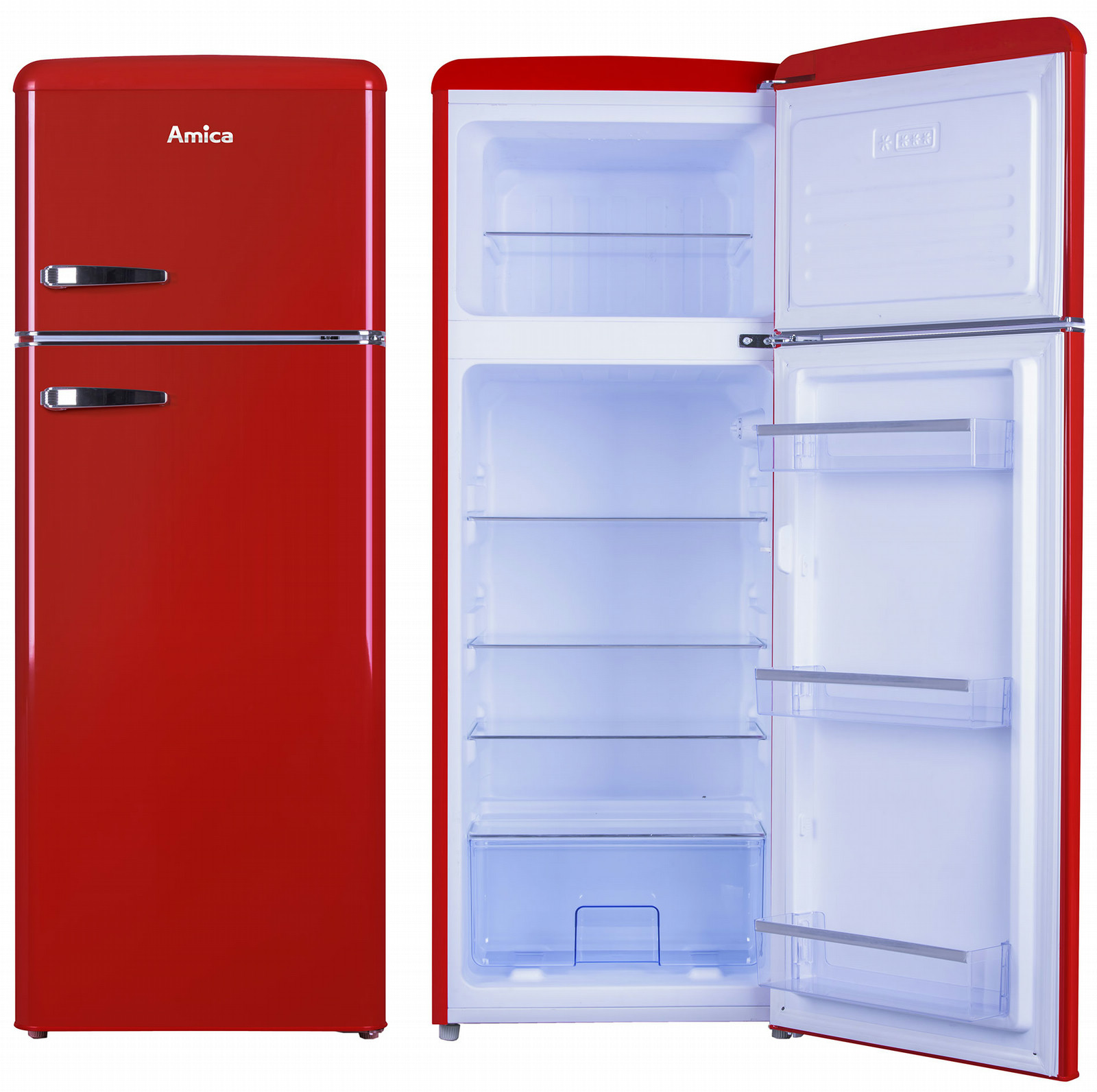 Amica KGC15630R. Тип корпуса: Отдельностоящий, Цвет товара: Красный, Дверная петля: Справа. Суммарная полезная емкость: 213 л, Тип климата: ST, Уровень шума: 40 дБ. Полезная емкость холодильника: 168 л. Размещение морозильной камеры: Расположен сверху, Полезная емкость морозильной камеры: 45 л, Вместимость морозильной камеры: 2,5 кг/24ча. Класс энергоэффективности: A++, Годовое потребление энергии: 172 кВт·ч