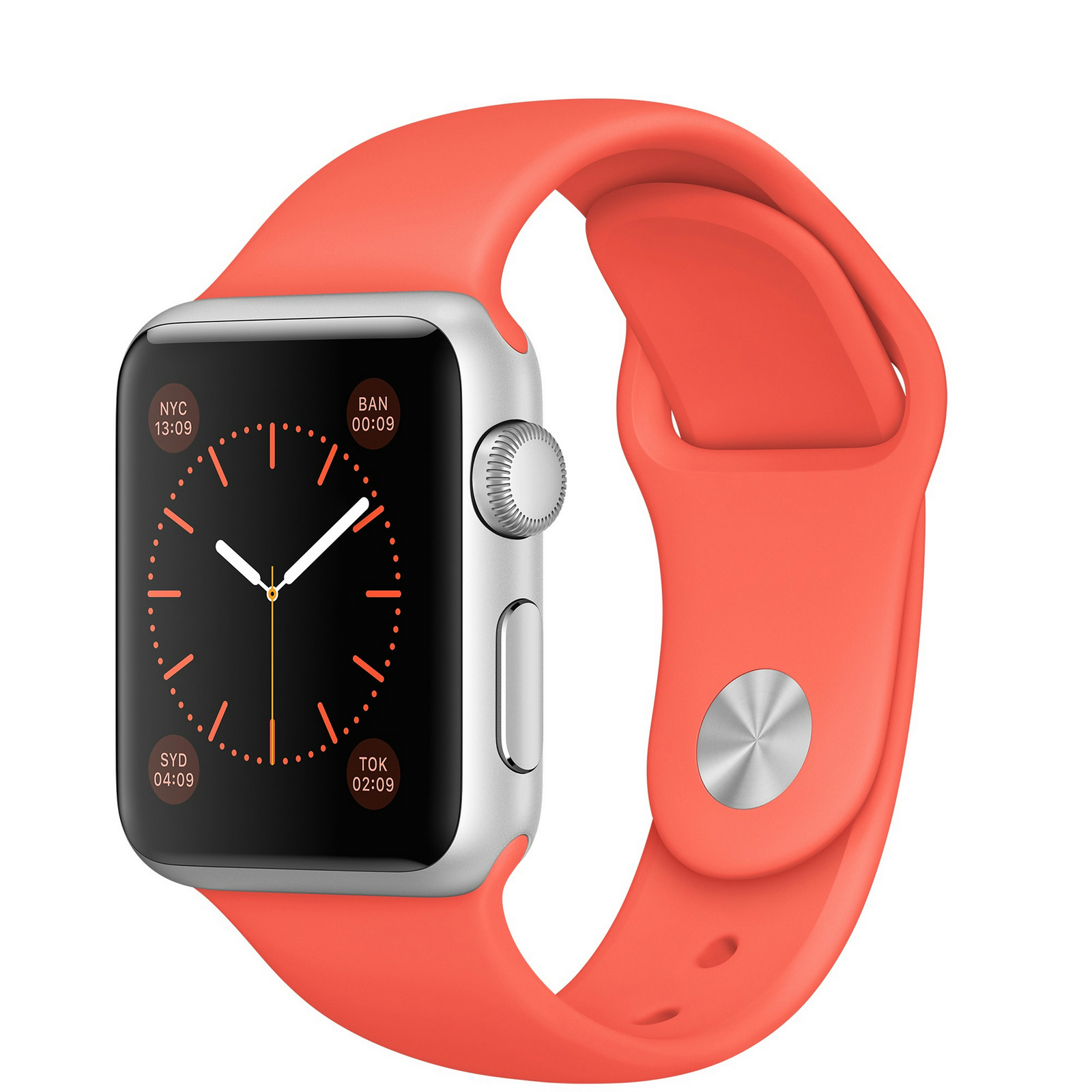 Apple Watch Sport. Цвет корпуса: Cеребряный, Материал корпуса: Алюминиевый, Цвет ремешка: Коралловый. Емкость RAM: 512 МБ, Флэш-память: 8 ГБ. Wi-Fi стандартов: 802.11b,802.11g,802.11n. Технология батареи: Литий-ионная (Li-Ion), Срок службы батареи: 18 ч. Ширина: 33,3 мм, Глубина: 38,6 мм, Толщина: 1,05 см