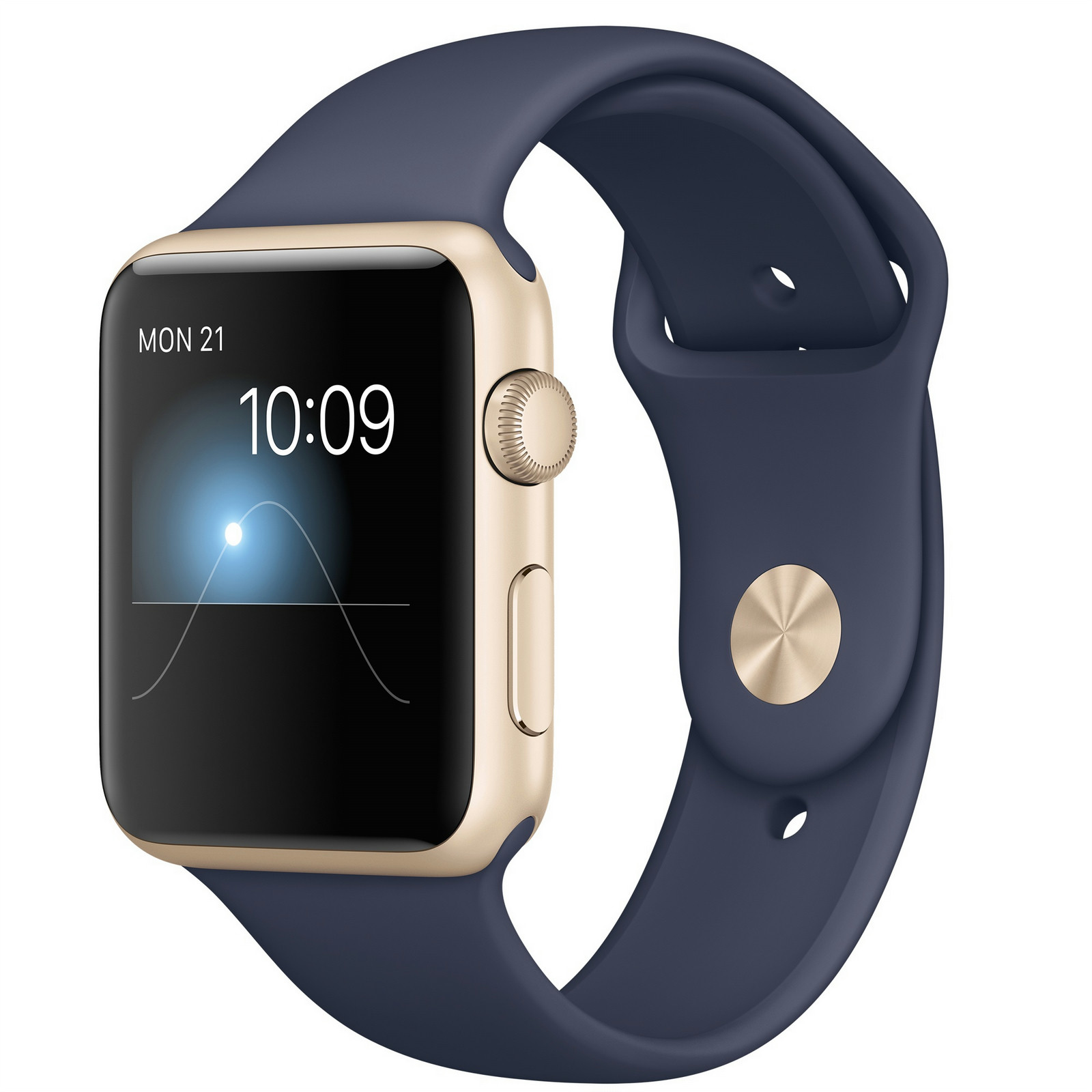 Apple Watch Sport. Цвет корпуса: Золотой, Материал корпуса: Алюминиевый, Цвет ремешка: Синий. Емкость RAM: 512 МБ, Флэш-память: 8 ГБ. Wi-Fi стандартов: 802.11b,802.11g,802.11n. Технология батареи: Литий-ионная (Li-Ion), Срок службы батареи: 18 ч. Ширина: 35,9 мм, Глубина: 42 мм, Толщина: 1,05 см