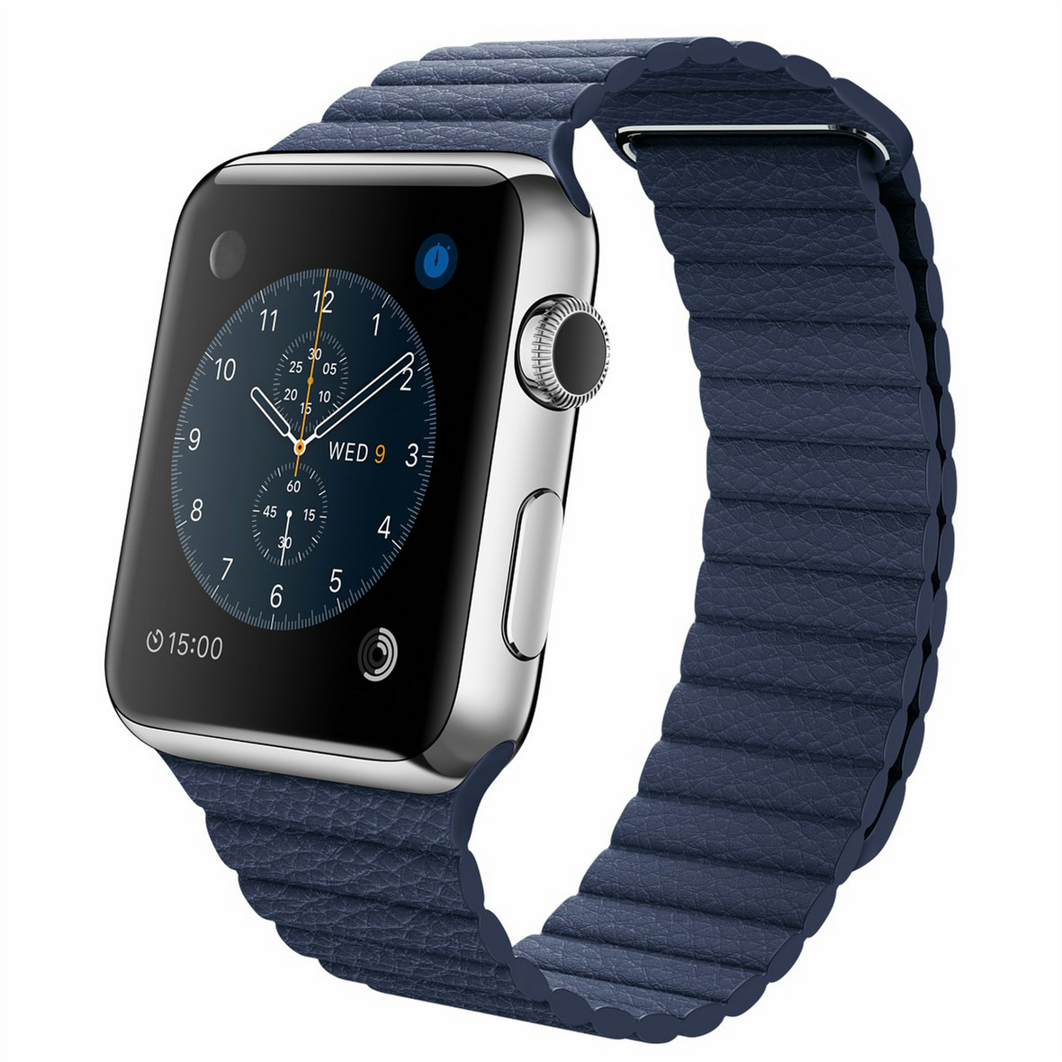 Apple Watch. Цвет корпуса: Нержавеющая сталь, Материал корпуса: Нержавеющая сталь, Цвет ремешка: Синий. Емкость RAM: 512 МБ, Флэш-память: 8 ГБ. Wi-Fi стандартов: 802.11b,802.11g,802.11n. Технология батареи: Литий-ионная (Li-Ion), Срок службы батареи: 18 ч, Время работы в режиме разговора: 3 ч. Ширина: 35,9 мм, Глубина: 42 мм, Толщина: 1,05 см