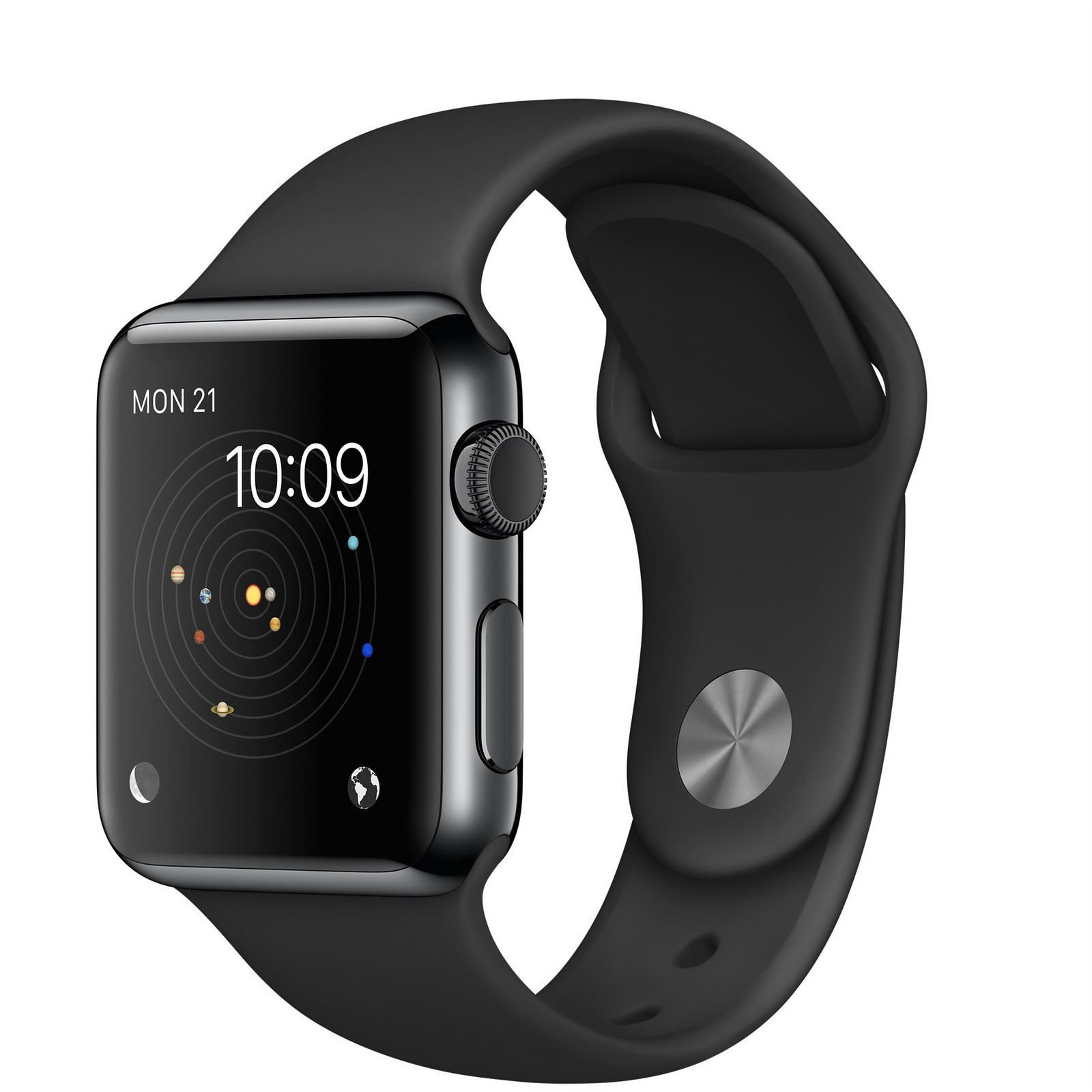 Apple Watch. Цвет корпуса: Черный, Материал корпуса: Нержавеющая сталь, Цвет ремешка: Черный. Емкость RAM: 512 МБ, Флэш-память: 8 ГБ. Wi-Fi стандартов: 802.11b,802.11g,802.11n. Технология батареи: Литий-ионная (Li-Ion), Срок службы батареи: 18 ч. Ширина: 33,3 мм, Глубина: 38,6 мм, Толщина: 1,05 см