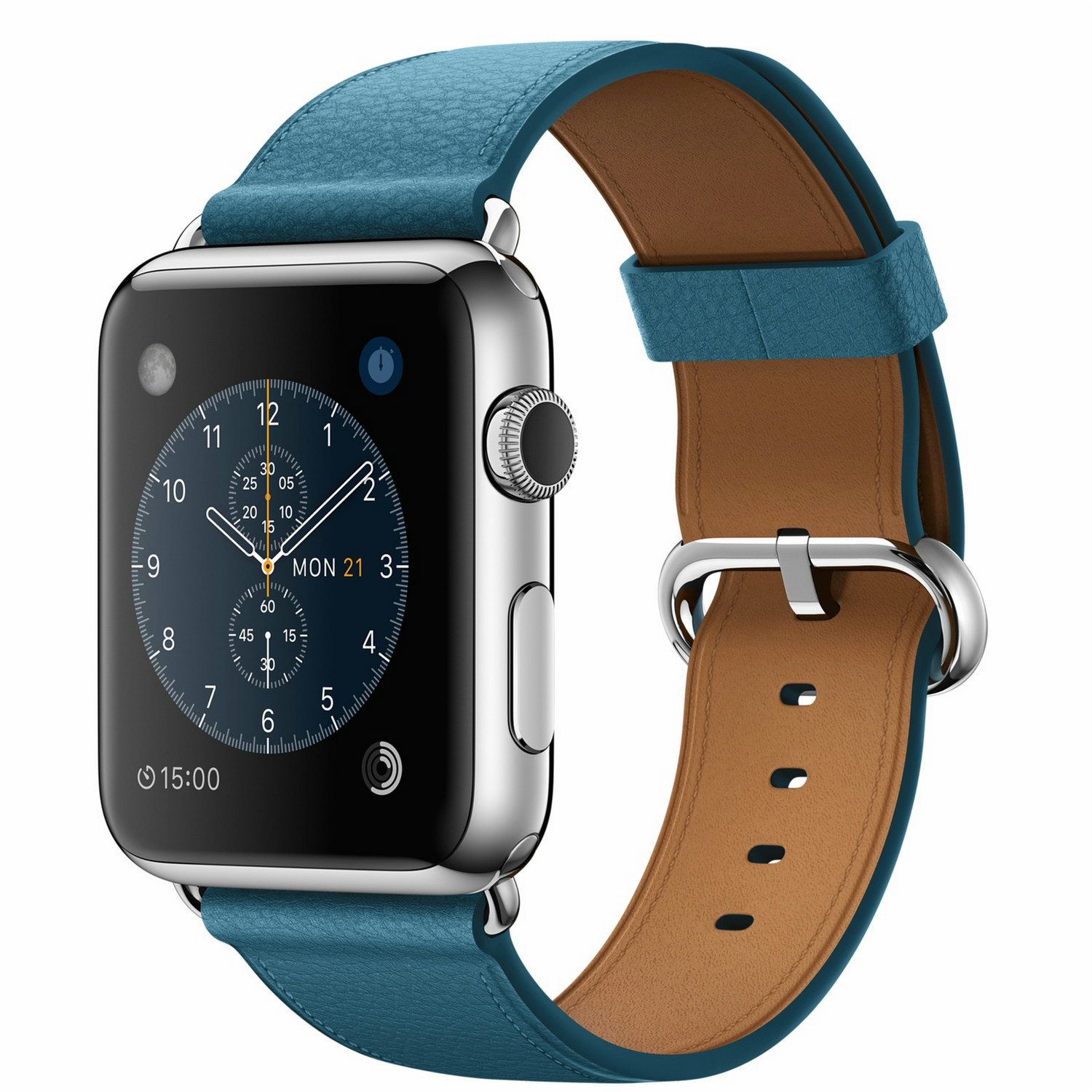 Apple Watch. Цвет корпуса: Нержавеющая сталь, Материал корпуса: Нержавеющая сталь, Цвет ремешка: Синий. Емкость RAM: 512 МБ, Флэш-память: 8 ГБ. Wi-Fi стандартов: 802.11b,802.11g,802.11n. Технология батареи: Литий-ионная (Li-Ion), Срок службы батареи: 18 ч. Ширина: 35,9 мм, Глубина: 42 мм, Толщина: 1,05 см