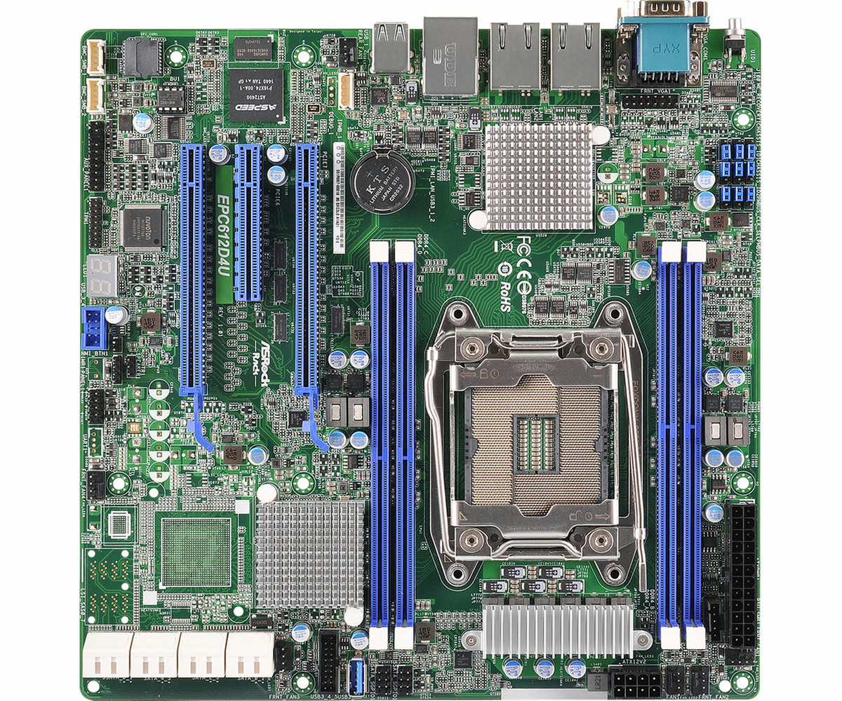 Asrock EPC612D4U. Формат материнской платы: Микро ATX, Комплектующие для: Сервер. Производитель процессора: Intel, Сокет процессора: LGA 2011 (Socket R), Количество поддерживаемых ядер процессора: 4, 6. Поддерживаемые типы памяти: DDR4-SDRAM, Поддерживаемые объемы модулей RDIMM: 4GB,8GB,16GB,32GB, Поддерживаемые объемы модулей LRDIMM: 64GB. Интерфейс жесткого диска: Serial ATA III, Уровни RAID: 0, 1, 5, 10. Чипсет материнской платы: Intel C612