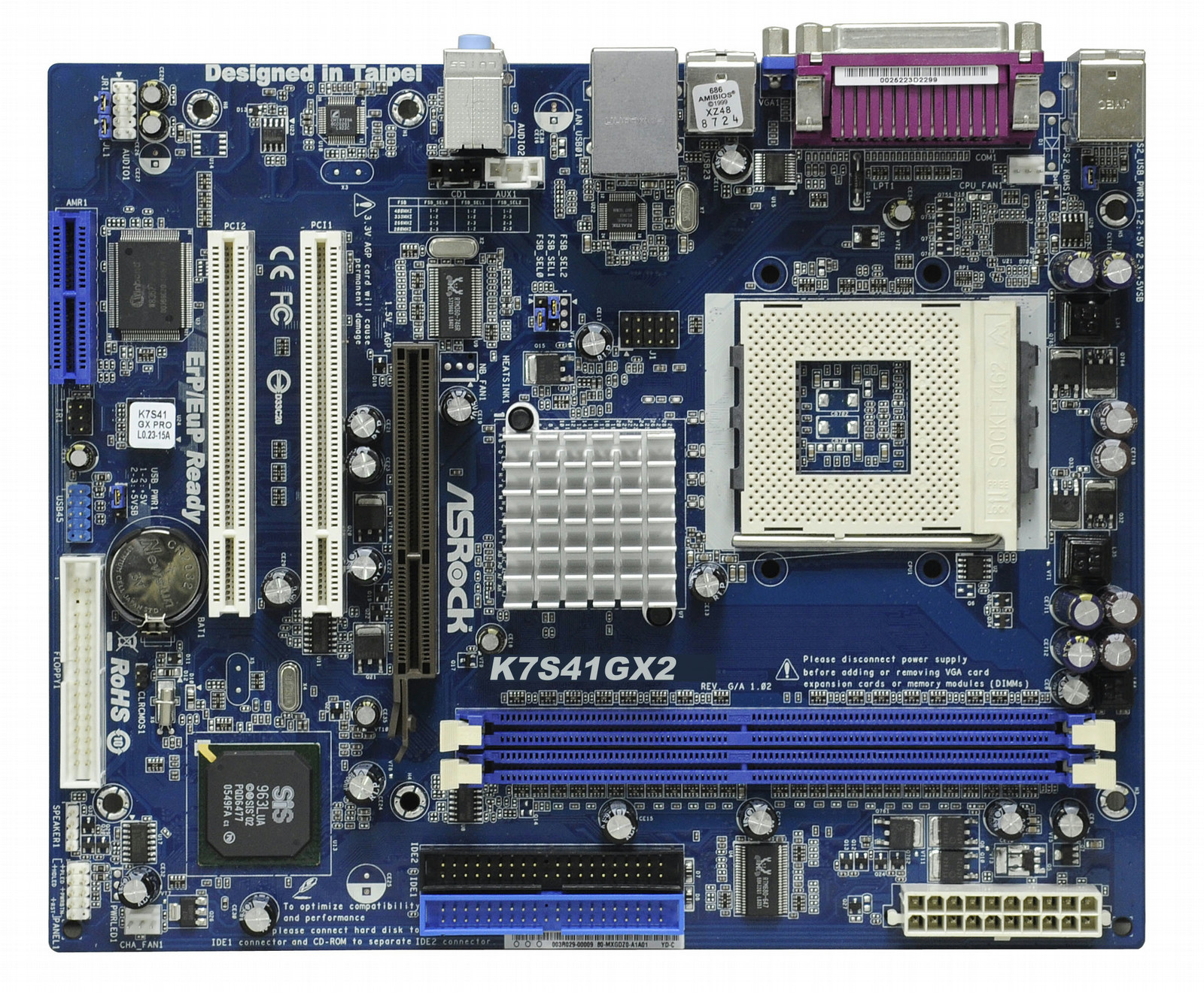 Asrock K7S41GX2. Поддерживаемые типы памяти: DDR-SDRAM, Тип слотов памяти: DIMM, Поддерживаемые частоты памяти: 266,333,400 МГц. Семейство процессоров: AMD, Совместимые серии процессоров: Athlon, Athlon XP, Sempron, Сокет процессора: Socket A (462). Поддерживаемые интерфейсы носителя: Parallel ATA. Характеристики сети: Fast Ethernet, Контроллер LAN: Realtek RTL8201E(L), Тип Ethernet интерфейса: Fast Ethernet. Комплектующие для: ПК, Семейство чипсета материнской платы: AMD, Чипсет материнской платы: SiS 741GX