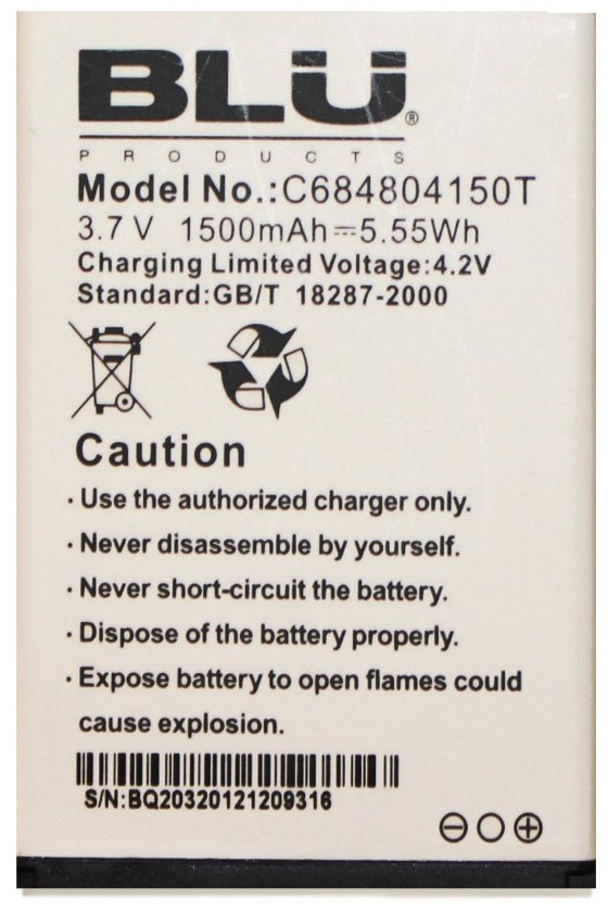 BLU C694804150T. Технология батареи: Литий-ионная (Li-Ion), Емкость батареи: 1500 мА·ч, Предназначение: Навигатор / Портативный мобильный компьютер / Мобильный телефон