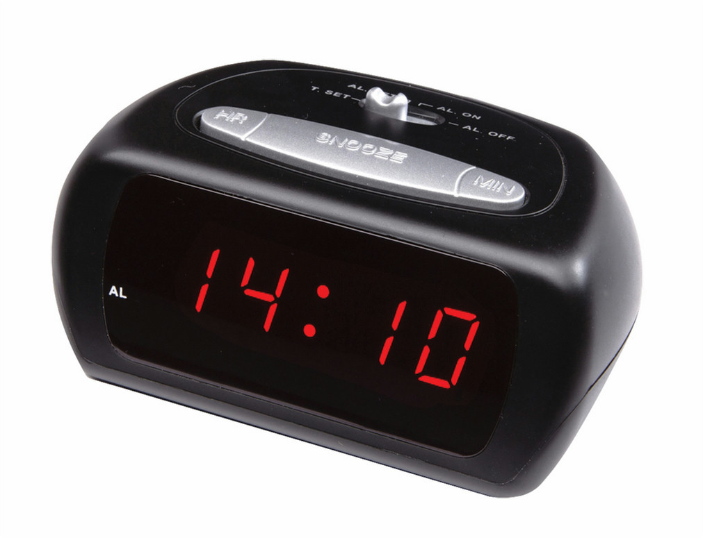 LED Alarm clock This black LED alarm clock with a snooze alarm has a 0.6 inch display with red digits.