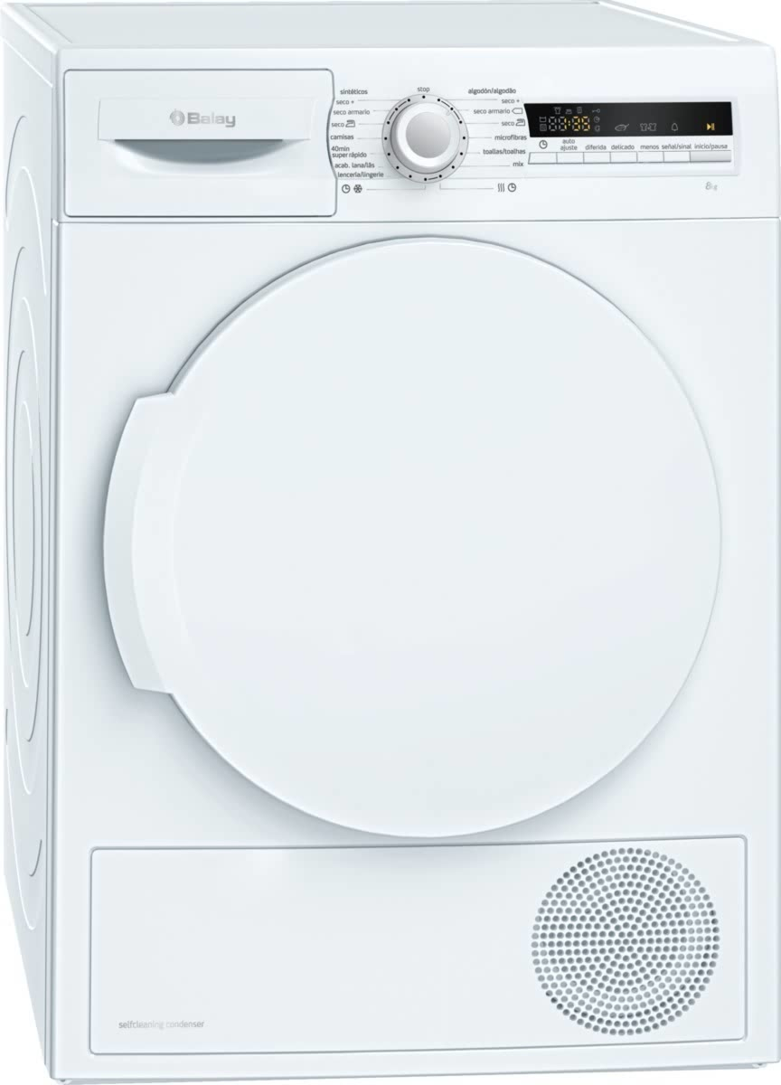 Balay 3SB987B1. Тип корпуса: Отдельностоящий, Тип загрузки: Фронтальная загрузка, Система сушки: Конденсация. Емкость барабана: 8 кг, Класс сушки: A, Продолжительность цикла: 203 мин. Программируемое время старта (макс.): 24 ч. Класс энергоэффективности: A++, Подключенная нагрузка: 1000 Вт, Входящее напряжение сети: 220-240 В. Ширина: 598 мм, Глубина: 652 мм, Высота: 842 мм