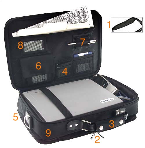 fully padded computer section and Zip or 3.5” diskette mesh pockets |