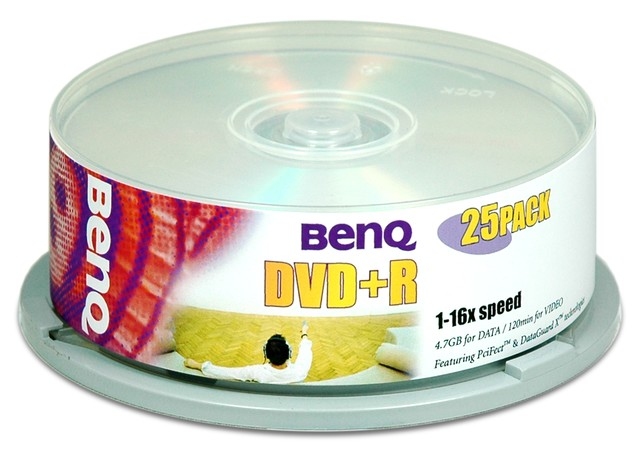 Benq 25xDVD+R 4,7GB. Емкость до сжатия: 4,7 ГБ, Тип: DVD+R, Количество в упаковке: 25 шт. Тип упаковки: cakebox