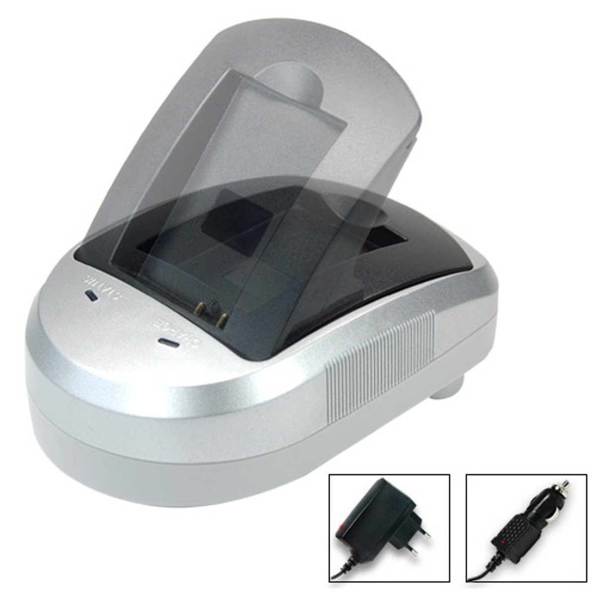 Blumax 300888. Тип зарядного устройства: Авто, Для помещений, Совместимые устройства: Цифровая камера, Тип источника питания: Кабель переменного тока, Прикуриватель. Цвет товара: Cеребряный