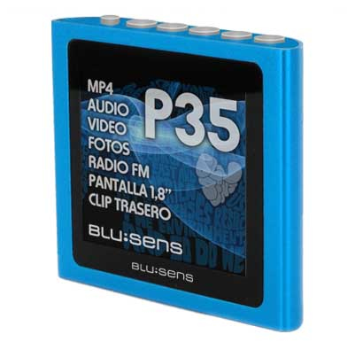 Blusens P35 8GB. Тип: MP4. Цвет товара: Синий. Тип носителей для плеера: Flash-media, Полный объем хранения: 8 ГБ, Video memory capacity: 48 ч. Дисплей: ЖК, Диагональ экрана: 4,57 см (1.8"), Разрешение экрана: 160 x 128 пикселей. Поддерживаемые форматы аудио: MP3, OGG, WMA, Поддерживаемый видеоформат: AMV, Поддерживаемые форматы изображения: BMP, GIF, JPG