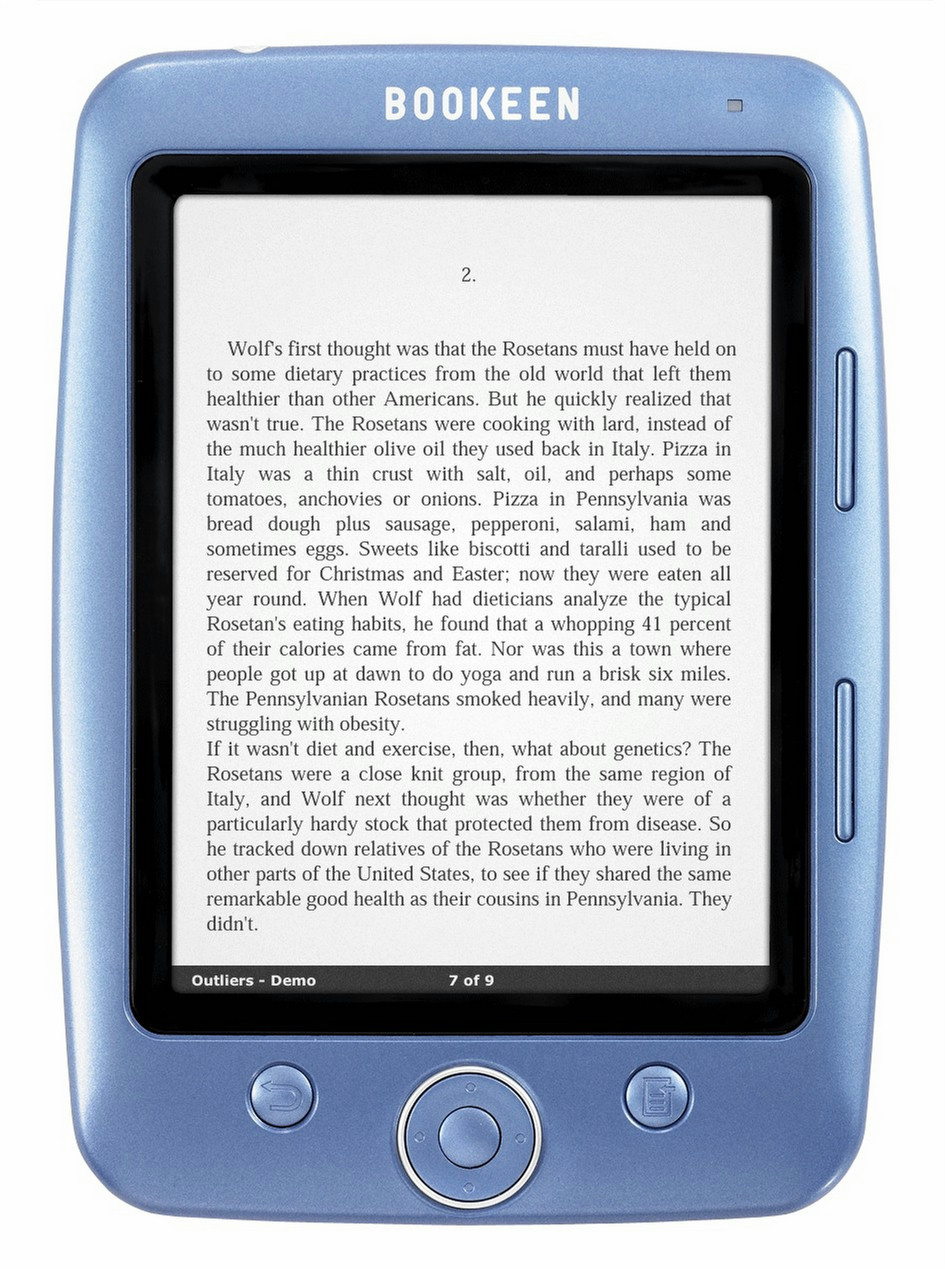 Bookeen Cybook OPUS. Диагональ: 12,7 см (5"), Технология: E Ink, Разрешение экрана: 600 x 800 пикселей. Подерживаемые форматы документов: ePub,FB2,HTML,PDF,TXT, Поддерживаемые форматы изображения: GIF,JPG,PNG. Емкость встроенной памяти: 1 ГБ, Совместимые карты памяти: microSD (TransFlash), Внутренняя память RAM: 32 МБ. Тактовая частота процессора: 400 МГц, Встроенный процессор: Samsung ARM. Тип интерфейса: USB 2.0