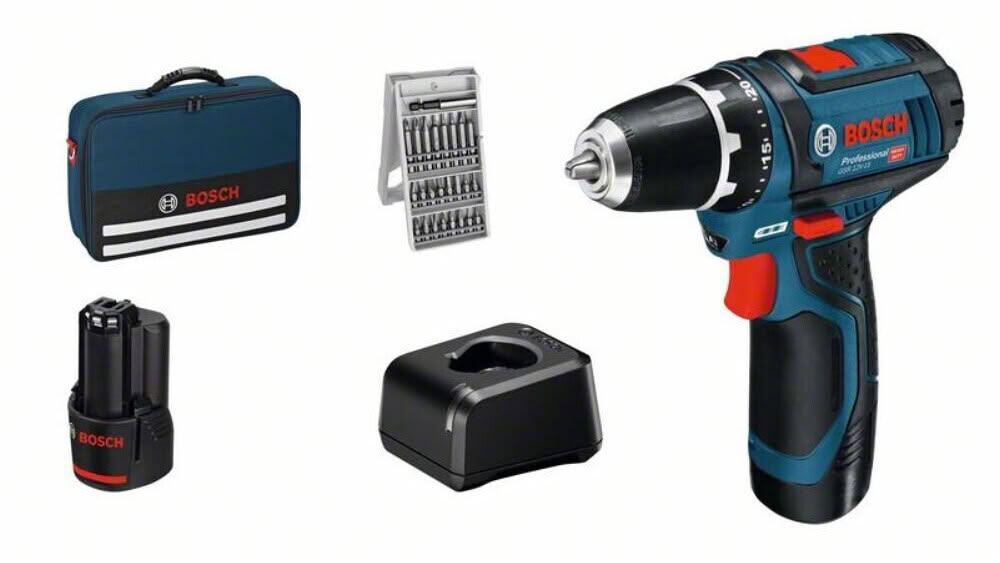 Комплект поставки: 2 аккумулятора, аккумуляторная дрель-шуруповерт, набор бит, зарядное устройство