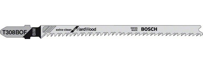 Bosch T 308 BOF. Тип продукта: Jigsaw blade, Подходит для материалов: Твёрдая древесина, Фанера, Мягкая древесина, Материал лезвия: Биметалл. Расстояние между зубьями лезвия: 2,2 мм. Overall length: 11,7 см. Количество в упаковке: 5 шт