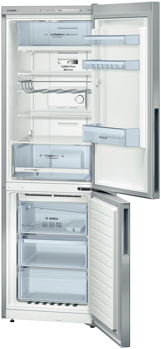 Bosch KGN36VL31. Тип корпуса: Отдельностоящий, Цвет товара: Нержавеющая сталь, Дверная петля: Справа. Суммарная полезная емкость: 319 л, Тип климата: SN-T, Уровень шума: 42 дБ. Полезная емкость холодильника: 233 л, Тип лампы: LED, Диапазон температуры холодильной камеры: 4 - 8 °C. Размещение морозильной камеры: Расположен снизу, Полезная емкость морозильной камеры: 86 л, Вместимость морозильной камеры: 14 кг/24ча. Класс энергоэффективности: A++, Подключенная нагрузка: 160 Вт, Годовое потребление энергии: 239 кВт·ч