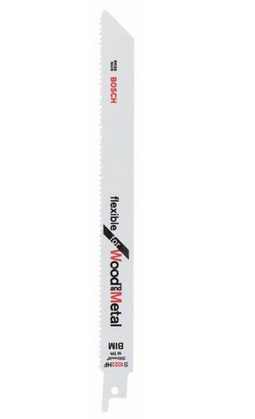 Bosch S 1022 HF. Тип продукта: Sabre saw blade, Подходит для материалов: Труба, Профиль, Листовой металл, Дерево с гвоздями, Материал лезвия: Биметалл. Расстояние между зубьями лезвия: 2,5 мм, Толщина резки (макс.): 15 см. Overall length: 20 см. Количество в упаковке: 1 шт