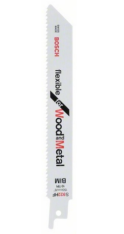 Bosch S 922 HF. Тип продукта: Sabre saw blade, Подходит для материалов: Профиль, Листовой металл, Дерево с гвоздями, Материал лезвия: Биметалл. Расстояние между зубьями лезвия: 2,5 мм, Толщина резки (макс.): 10 см. Overall length: 15 см. Количество в упаковке: 1 шт, Тип упаковки: Блистер