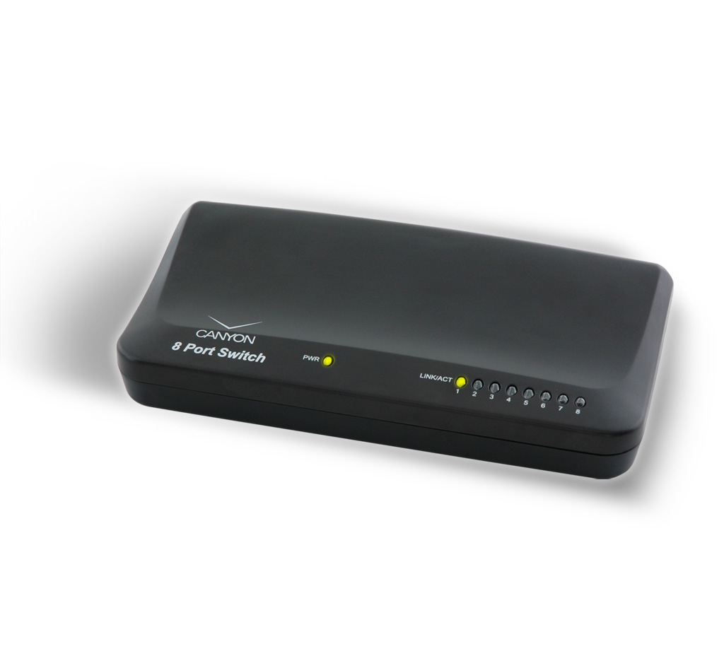 Canyon CNP-D08P. Тип свича: Unmanaged network switch. Тип свивки медного Ethernet: 100Base-TX,10Base-T. Стандарты сети: IEEE 802.3u,IEEE 802.3x. Размер адресной таблицы: 1000 записей, Скорость передачи данных (макс): 0,1 Гбит/с. Цвет товара: Черный, Сертификация: FCC, CE