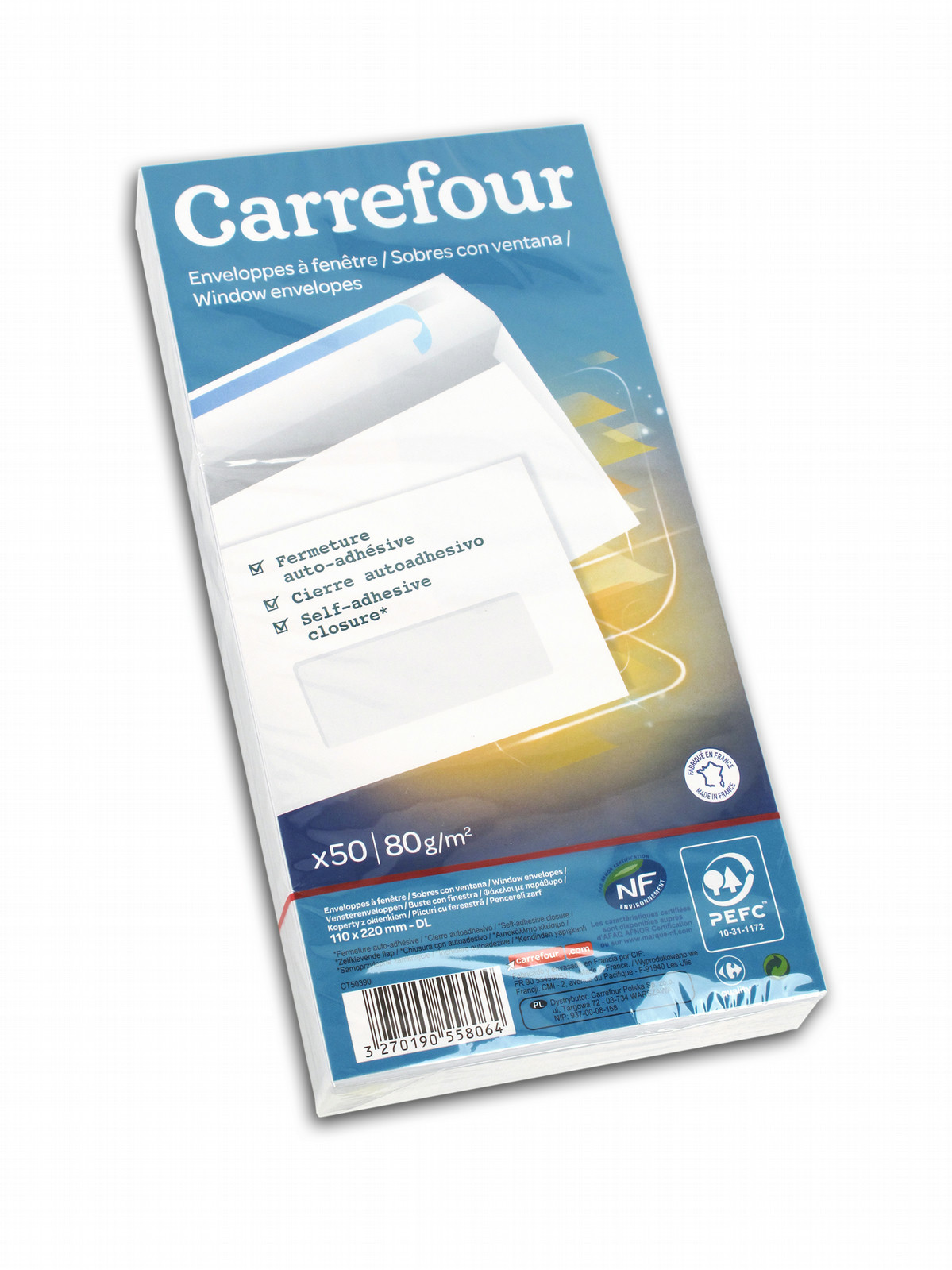 Carrefour 101721628. Цвет товара: Белый, Плотность бумаги: 80 г/м², Формат: DL (110 x 220mm). Ширина: 110 мм, Длина: 22 см. Количество в упаковке: 50 шт
