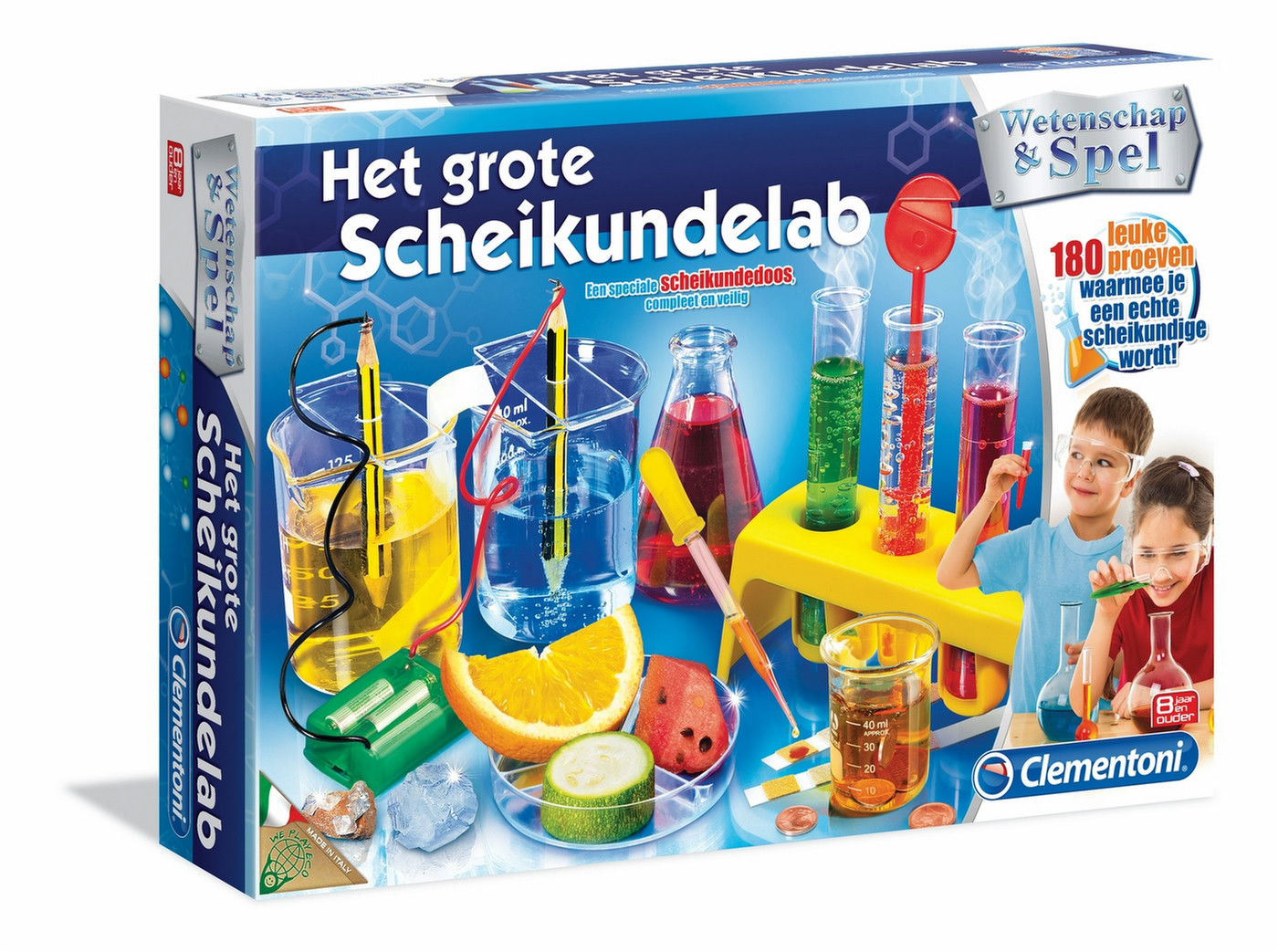Clementoni Mijn Groot Scheikundelabo. Тема: Химия, Тип продукта: Набор для опытов, Рекомендуемый возраст (мин): 8 лет. Тип батареек: AA. Ширина упаковки: 530 мм, Глубина упаковки: 90 мм, Высота упаковки: 360 мм