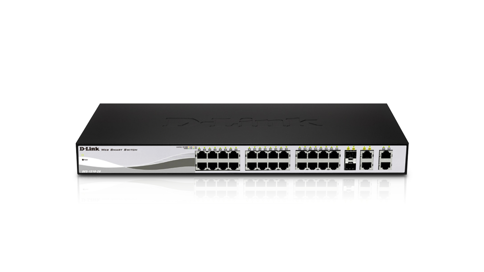 D-Link DES-1210-28. Тип свича: Managed network switch, Уровень свича: L2, Поддержка MIB: MIB II, Bridge MIB, SNMPv2 MIB, MIB Traps Convention, Interface Group MIB, Private MIB. Тип свивки медного Ethernet: 1000BASE-T,100BASE-T,100BASE-TX,10BASE-T. Стандарты сети: IEEE 802.3,IEEE 802.3ab,IEEE 802.3u,IEEE 802.3x,IEEE 802.3z. Размер адресной таблицы: 8000 записей, Коммутационная способность: 12,8 Гбит/с, Поддерживаемые скорости передачи данных: 10/100/1000 Mbps. Цвет товара: Черный, Формат: 1U, Светодиодные индикаторы: Ссылка, Напряжение
