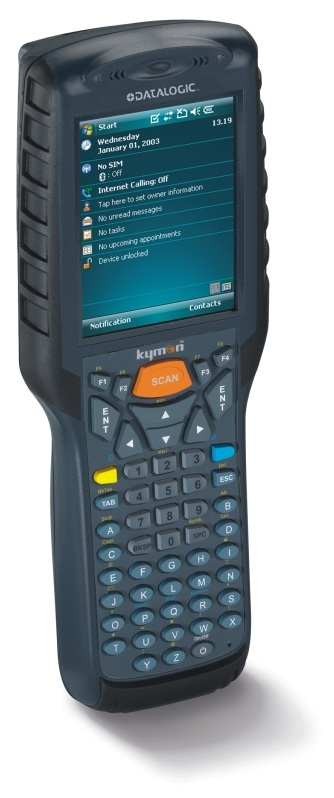 Datalogic Kyman. Диагональ экрана: 8,89 см (3.5"), Разрешение экрана: 320 x 240 пикселей, Дисплей: TFT. Оперативная память: 128 МБ, Совместимые карты памяти: miniSD, Флэш-память: 128 МБ. Тактовая частота процессора: 520 МГц, Семейство процессоров: X-Scale, Встроенный процессор: PXA270. Установленная операционная система: Windows Mobile CE 5.0. Беспроводная технология: WiFi, Wi-Fi стандартов: 802.11b,802.11g