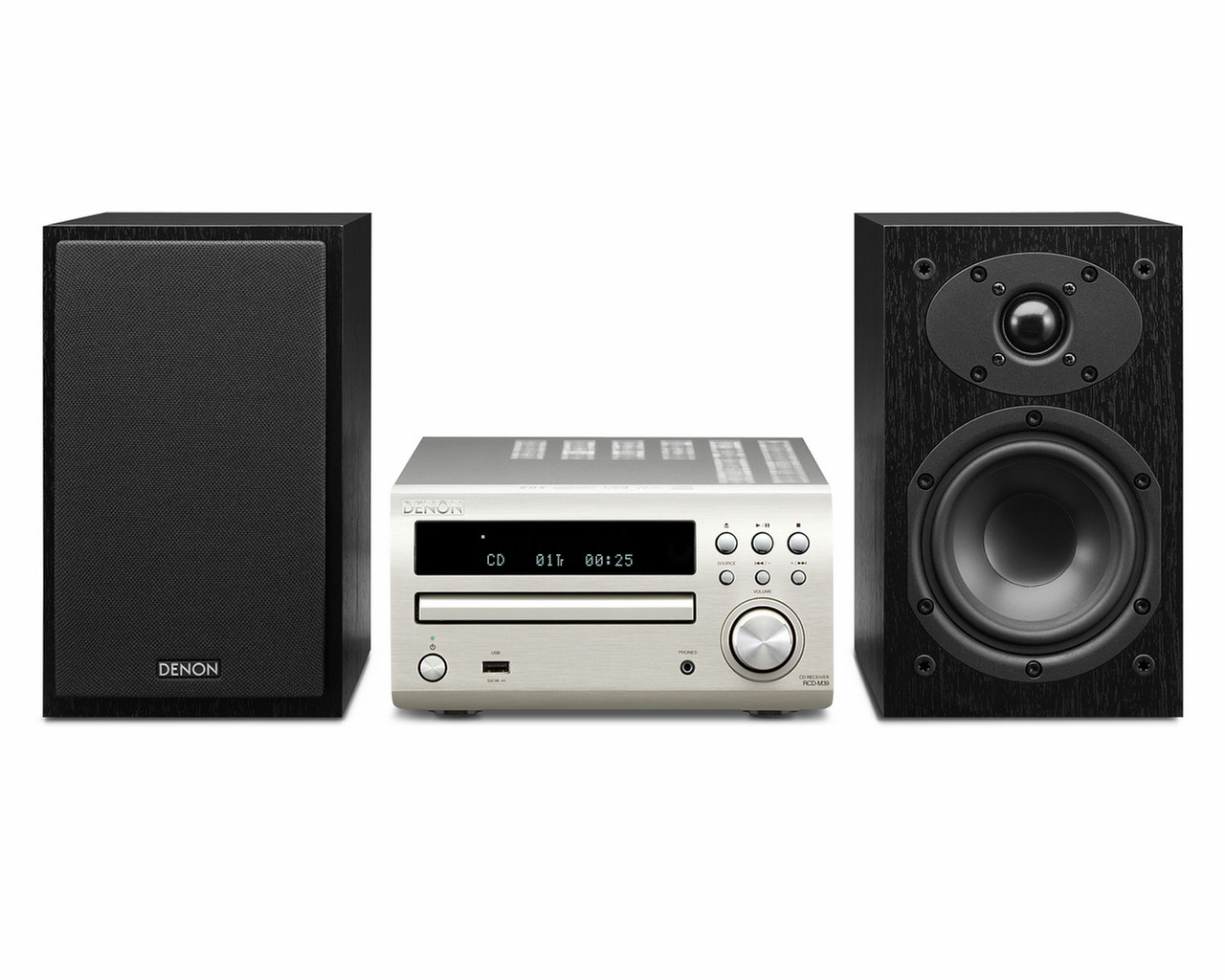 Denon D-M39DAB. Тип: Home audio micro system, Цвет товара: Черный, Cеребряный, Число дисков: 1 дисков. Номинальная RMS-мощность: 60 Вт, Тип колонок: 2-полосная, Woofer diameter: 12 см. Поддерживаемые диапазоны радио: DAB,DAB+,FM. Тип дисплея: ЖК. Поддерживаемые форматы аудио: MP3,WMA, Форматы дисков (воспроизведение): CD audio