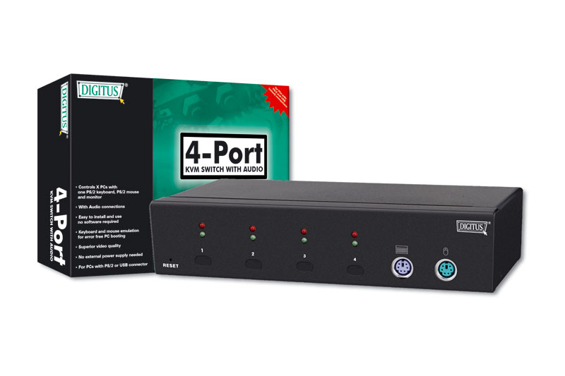 Digitus Combo KVM Switch 1User - 4PCs, Audio. Тип порта клавиатуры: PS/2, Тип порта мыши: PS/2, Тип видео порта: VGA. Максимальное разрешение: 2048 x 1536 пикселей. Цвет товара: Черный. Вес: 650 г. Тип подачи питания: DC, USB, PC2, Размеры (ШхГхВ): 88 x 215 x 45 мм, Совместимость: DDC, DDC2
