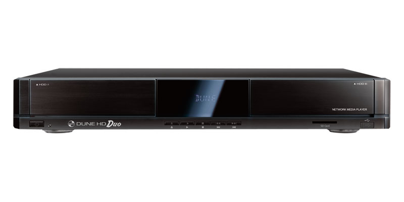 Dune HD Duo. Цвет товара: Черный. Совместимые карты памяти: SD, SDHC, Интерфейс жесткого диска: SATA. Поддерживаемые форматы изображения: BMP, GIF, JPG, PNG, Форматы сжатия видео: ASF, AVI, MOV, MP4, MPEG2, MPEG4, VOB, WMV, XVID, Поддерживаемые форматы субтитров: PGS. Система аналогового формата сигнала: NTSC, PAL. Аудио декодеры: Dolby Digital, Dolby Digital Plus, Dolby TrueHD, DTS, DTS-HD