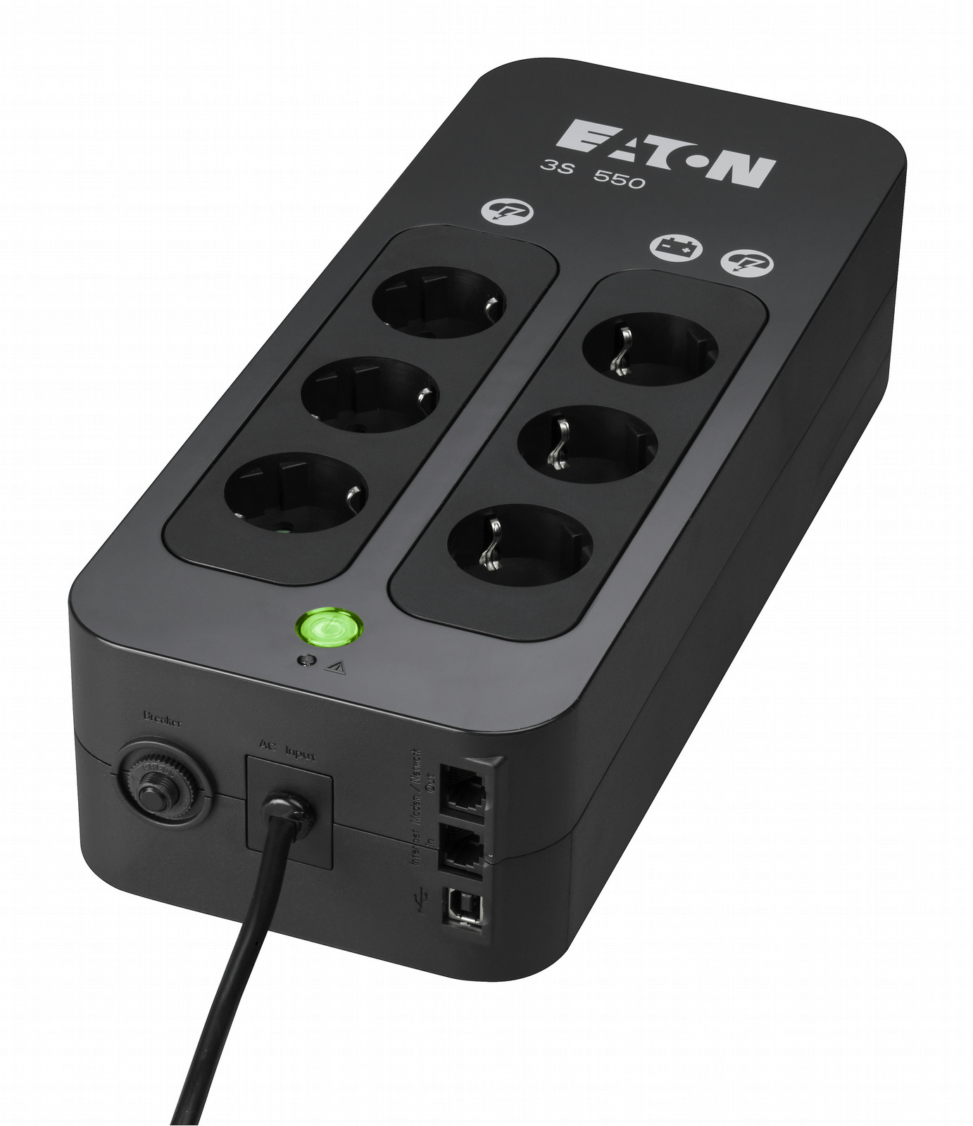 Eaton 3S 550 DIN. Выходная мощность: 550 ВА, Выходная мощность: 330 Вт, Входное напряжение (мин): 161 В. Типы розеток: Тип F, Количество розеток: 6 розетка(и). Технология батареи: Герметичная свинцово-кислотная (VRLA), Обычное время резервирования при половинной загрузке: 9 мин, Обычное время резервирования при полной загрузке: 3 мин. Формат: Mini Tower, Цвет товара: Черный. Функции защиты напряжения: Факс, Modem, Сеть, Телефон