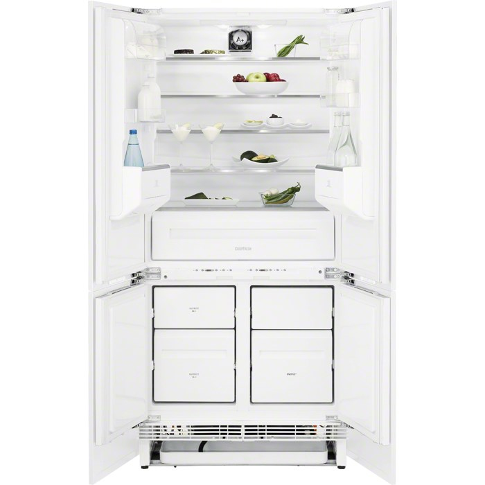 Electrolux FI5004NA+. Тип корпуса: Встроенный, Цвет товара: Белый, Дизайн: Американская дверь. Суммарная полезная емкость: 434 л, Суммарная максимальная емкость: 470 л, Тип климата: SN-ST. Полезная емкость холодильника: 338 л, Максимальная емкость холодильника: 342 л. Полезная емкость морозильной камеры: 96 л, Максимальная емкость морозильника: 128 л, Размещение морозильной камеры: Расположен снизу. Класс энергоэффективности: A+, Подключенная нагрузка: 280 Вт, Годовое потребление энергии: 344 кВт·ч