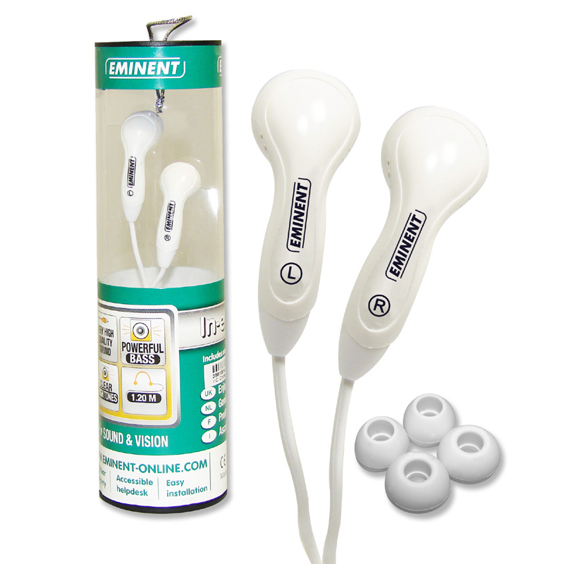 Eminent In-ear Earplugs White. Тип наушников: Вкладыши, Стиль ношения: Вкладыши, Частота наушников: 100 - 18000 Гц. Технология подключения: Проводная, Интерфейс устройства: 3,5 мм (1/8"), Длина кабеля: 1,2 м. Цвет товара: Белый