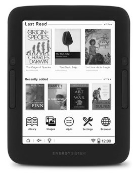 Energy Sistem eReader Pro. Диагональ: 15,2 см (6"), Технология: E Ink, Разрешение экрана: 758 x 1024 пикселей. Подерживаемые форматы документов: CHM, ePub, FB2, HTML, MOBI, PDF, RTF, TXT, Поддерживаемые форматы аудио: MP3, OGG, WAV, WMA, Поддерживаемые форматы изображения: BMP, GIF, JPG, PNG. Емкость встроенной памяти: 8 ГБ, Совместимые карты памяти: MicroSD (TransFlash), MicroSDHC, Максимальный объем флеш-карты: 64 ГБ. Тактовая частота процессора: 1000 МГц, Встроенный процессор: ARM Cortex A9. Тип USB коннектора: Micro-USB