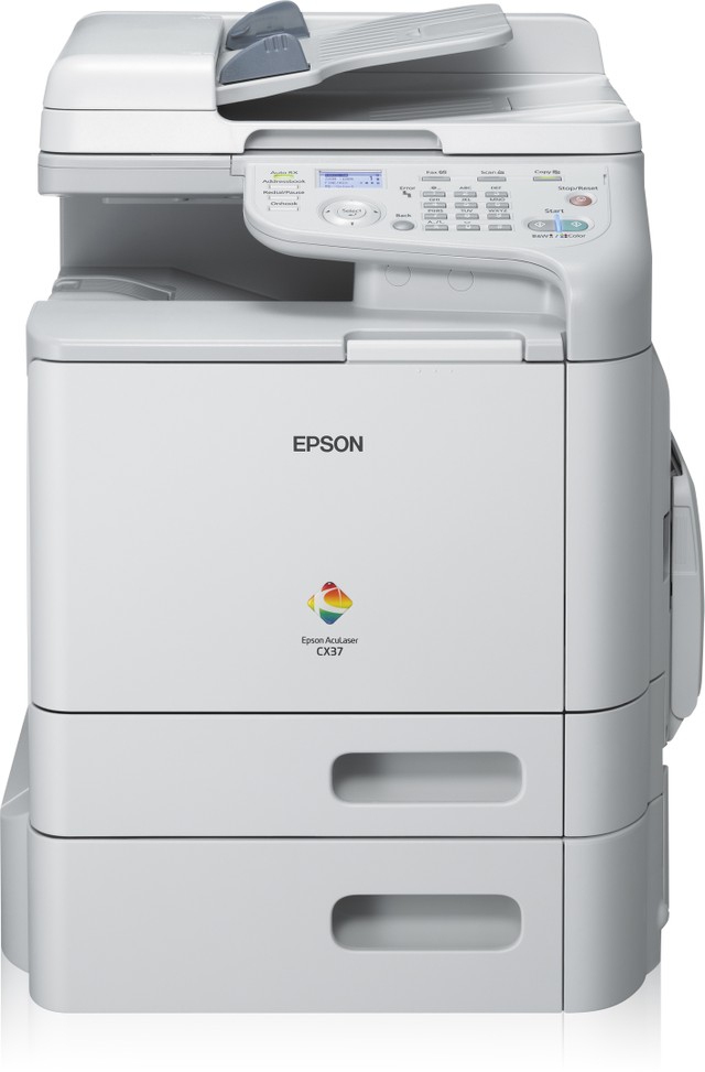 Epson CX37DTNF, AcuLaser. Технология печати: Лазерный, Печать: Colour printing, Копирование: Colour copying. Скорость печати (ч/б, обычное кач., A4/US Letter): 24 стр/мин, Максимальное разрешение: 600 x 600 dpi, Стандартные языки принтера: PCL 5c,PCL 6,PDF 1.7,PostScript 3. Максимальное разрешение копирования: 600 x 600 dpi, Масштабирование копии: 25 - 400%, Максимальное число копий: 99 копий. Разрешение оптического сканирования: 600 x 600 dpi, Тип сканирования: Планшетный + ADF, Максимальная область сканирования: 215,9 x 297 мм. Скорость передачи факса: 3 с/стор, Скорость модема: 33,6 кбит/с, Память факса: 6 МБ