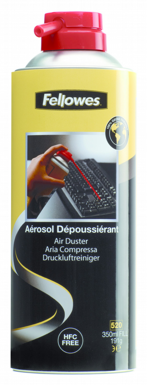 Fellowes 9974906. Тип продукта: Equipment cleansing air pressure cleaner, Назначение: Keyboards, Объем: 350 мл. Ширина: 65 мм, Глубина: 65 мм, Высота: 185 мм