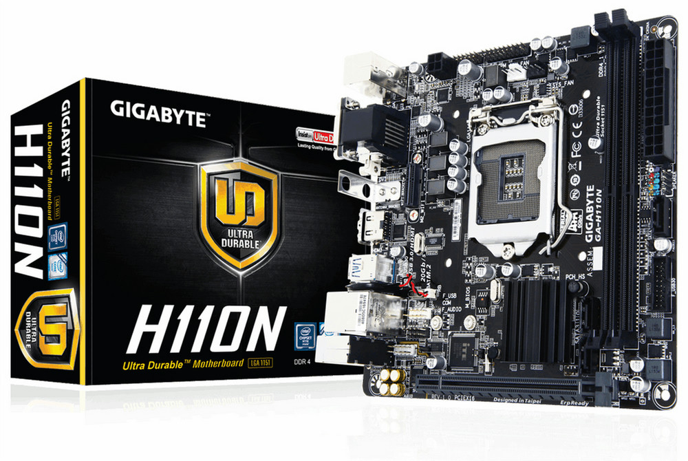 Gigabyte GA-H110N. Поддерживаемые типы памяти: DDR4-SDRAM, Тип слотов памяти: DIMM, Поддерживаемые частоты памяти: 2133 МГц. Семейство процессоров: Intel, Совместимые серии процессоров: Celeron,Core i3,Core i5,Core i7,Pentium. Поддерживаемые интерфейсы носителя: SATA. Тип Ethernet интерфейса: Гигабитный Ethernet. Комплектующие для: ПК, Семейство чипсета материнской платы: Intel, Чипсет материнской платы: Intel H110