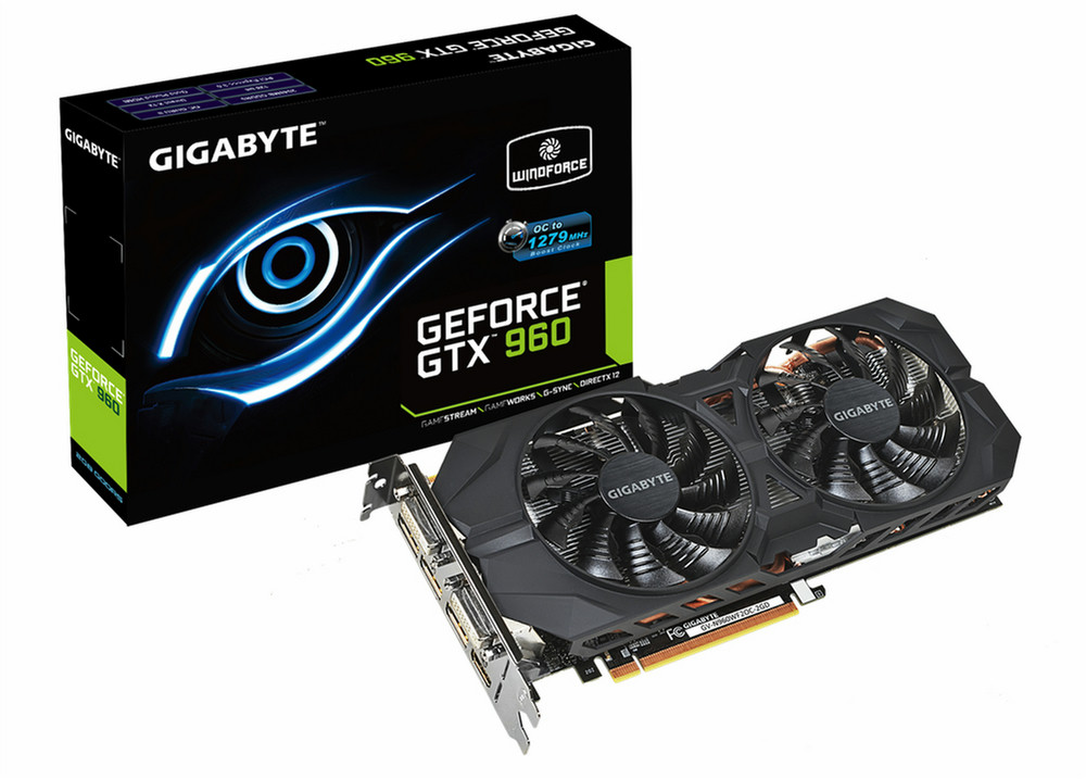 Gigabyte GV-N960WF2OC-2GD. Graphics processor family: NVIDIA, Графический процессор: GeForce GTX 960, Максимальное разрешение: 4096 x 2160 пикселей. Объём памяти дискретного графического адаптера: 2 ГБ, Тип памяти графического адаптера: GDDR5, Шина памяти: 128 бит. Тип интерфейса: PCI Express 3.0. Версия DirectX: 12.0, Версия OpenGL: 4.4. Тип охлаждения: Aктивный, Формат: ATX