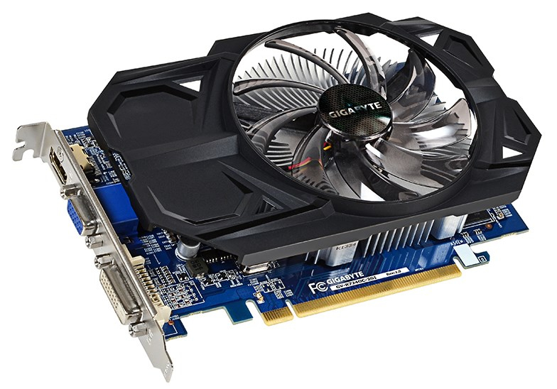 Gigabyte GV-R724OC-2GI (rev. 2.0). Graphics processor family: AMD, Графический процессор: Radeon R7 240, Максимальное разрешение: 2560 x 1600 пикселей. Объём памяти дискретного графического адаптера: 2 ГБ, Тип памяти графического адаптера: GDDR3, Шина памяти: 128 бит. Тип интерфейса: PCI Express 3.0. Версия DirectX: 11.2, Версия OpenGL: 4.2. Тип охлаждения: Aктивный, Формат: ATX