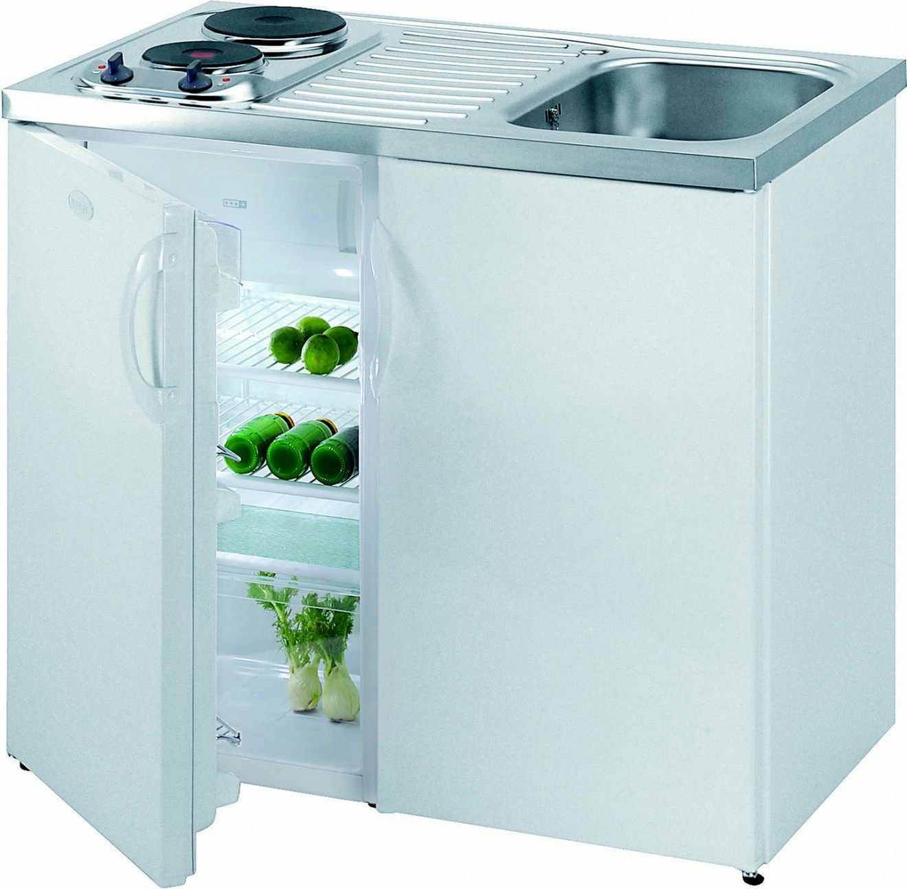 Gorenje MK100S-R-4. Обычные конфорки: 1500 Вт, Мощность большой конфорки: 2000 Вт, Диаметр конфорки медленного приготовления: 14,5 см. Полезная емкость холодильника: 101 л, Класс энергоэффективности (холодильник): A+. Полезная емкость морозильной камеры: 17 л, Star рейтинг: 4*, Время хранения при отключении питания: 12 ч. Цвет товара: Белый, Форма раковины: Oвальный, Тип управления: Вращающийся. Подключенная нагрузка (электрическая): 3570 Вт