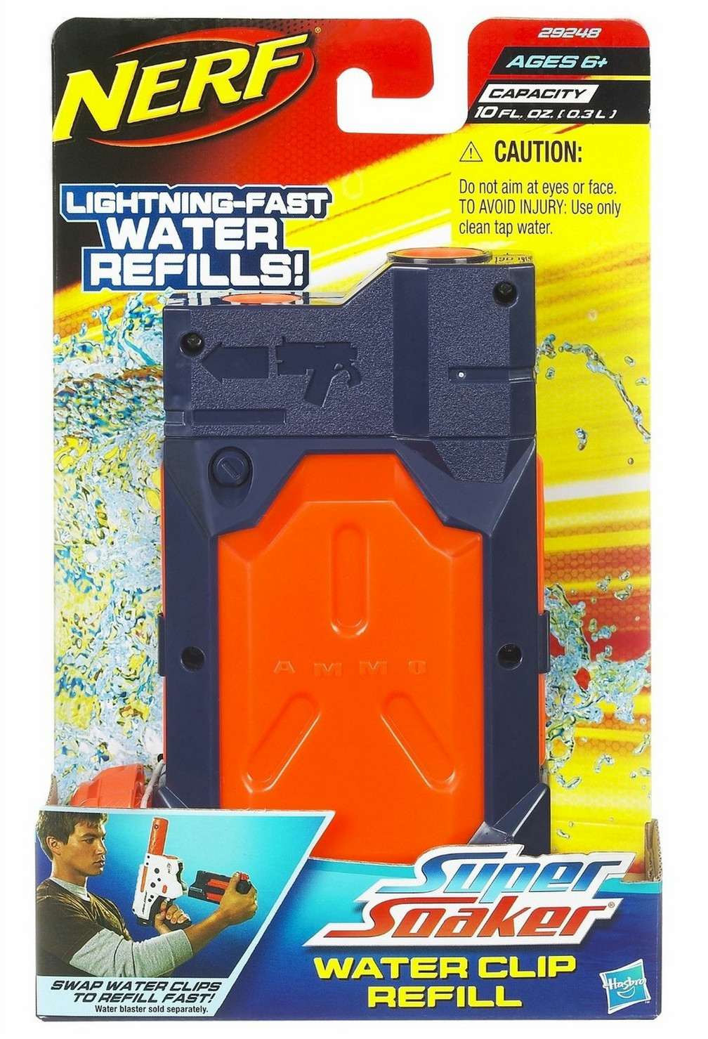 Hasbro 29248. Тип: Заправка, Цвет товара: Синий, Оранжевый, Совместимые продукты: Nerf - Super Soaker. Количество в упаковке: 1 шт