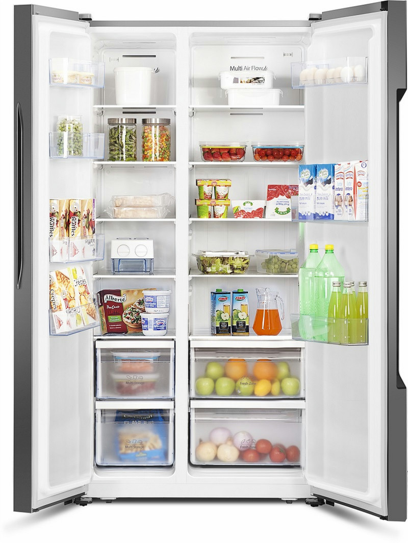 Hisense SBS 518A+ EL. Тип корпуса: Отдельностоящий, Цвет товара: Нержавеющая сталь, Дизайн: Американская дверь. Суммарная полезная емкость: 516 л, Тип климата: SN-ST, Уровень шума: 43 дБ. Полезная емкость холодильника: 339 л, Максимальная емкость холодильника: 350 л. Полезная емкость морозильной камеры: 177 л, Размещение морозильной камеры: Низ, Вместимость морозильной камеры: 11 кг/24ча. Класс энергоэффективности: A++, Годовое потребление энергии: 344 кВт·ч