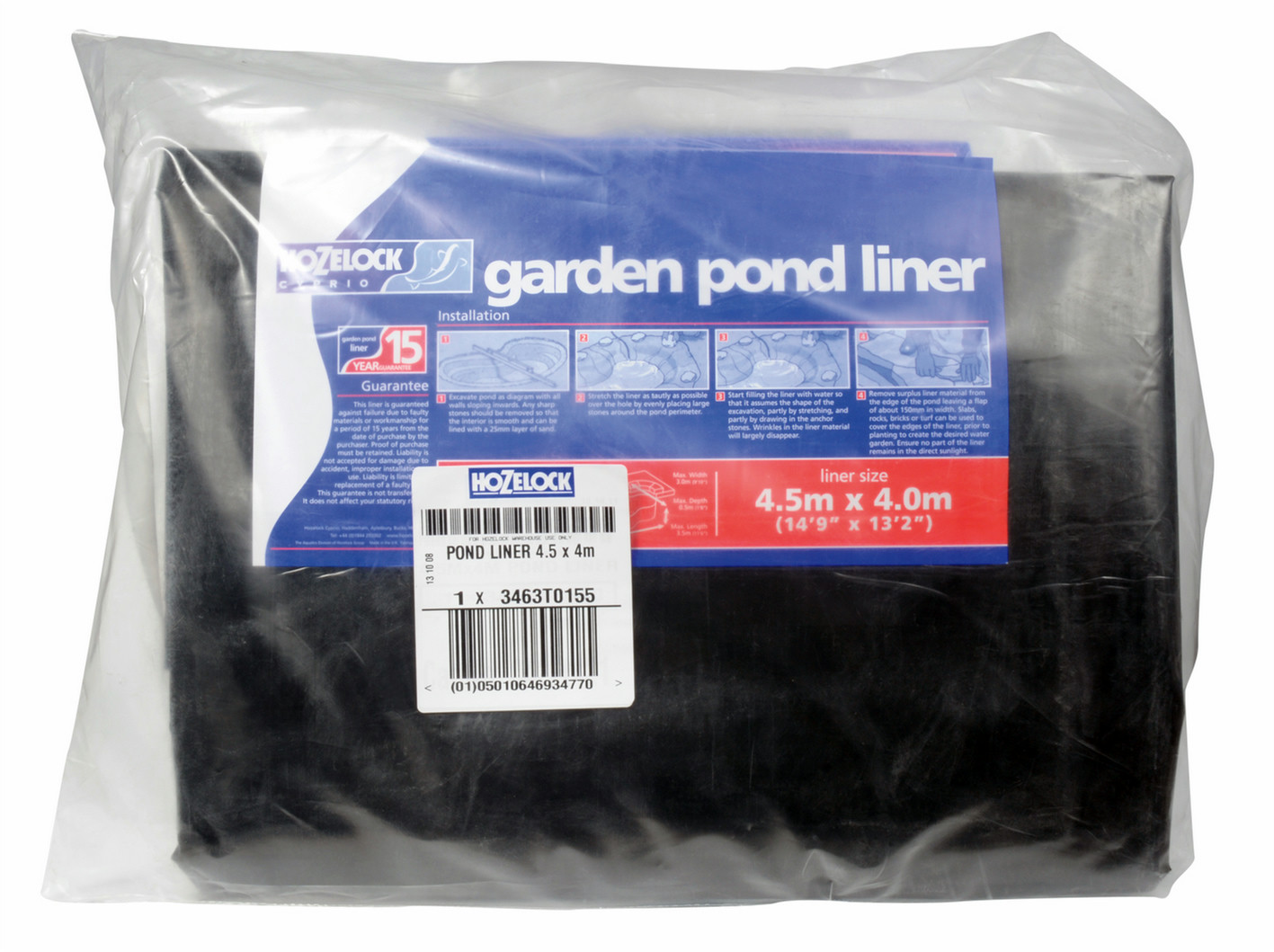 Hozelock 3463. Тип продукта: Материал для гидроизоляции пруда, Цвет товара: Черный, Материал: ПВХ. Ширина: 4500 мм, Глубина: 4000 мм, Ширина упаковки: 600 мм
