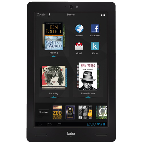 Kobo ARC 64GB. Диагональ: 17,8 см (7"), Разрешение экрана: 1280 x 800 пикселей, Форматное соотношение: 16:10. Подерживаемые форматы документов: ePub, Поддерживаемые форматы аудио: 3GA,AAC,AAC+,FLAC,M4A,MIDI,MP3,MP4,OGG,WAV, Поддерживаемые форматы изображения: BMP,GIF,JPG,PNG. Емкость встроенной памяти: 64 ГБ, Внутренняя память RAM: 1024 МБ. Тактовая частота процессора: 1500 МГц, Встроенный процессор: TI OMAP 4470. Порт подключения наушников: 3,5 мм, Тип интерфейса: USB 2.0, Wi-Fi стандартов: 802.11b,802.11g,802.11n