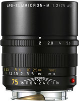 Leica Apo-Summicron-M 75mm f/2. Структура линзы (элементы/группы): 7/5, Фиксированное фокусное расстояние: 7,5 см, Наименьшее фокусное расстояние: 0,7 м. Совместимые продукты: Leica M9. Цвет товара: Черный. Диаметр: 5,8 см, Длина: 6,68 см, Вес: 430 г