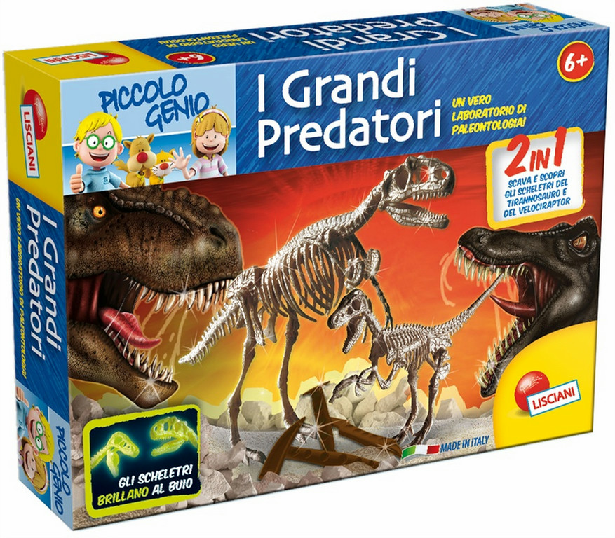 Lisciani 40278. Тема: Палеонтология, Рекомендуемый возраст (мин): 7 лет, Рекомендуемый пол: Мальчик / Девочка. Ширина: 525 мм, Глубина: 395 мм, Высота: 270 мм. Содержимое упаковки: Fossil shines in the darkness of Velociraptor - Fossil shines in the dark T-Rex - Digging Tools