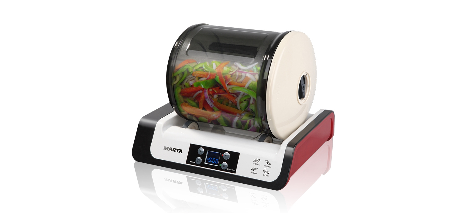Благодаря работе автоматического вакуумного насоса и вращению емкости с продуктами маринатор позволяет замариновать мясо всего за 10 минут.
