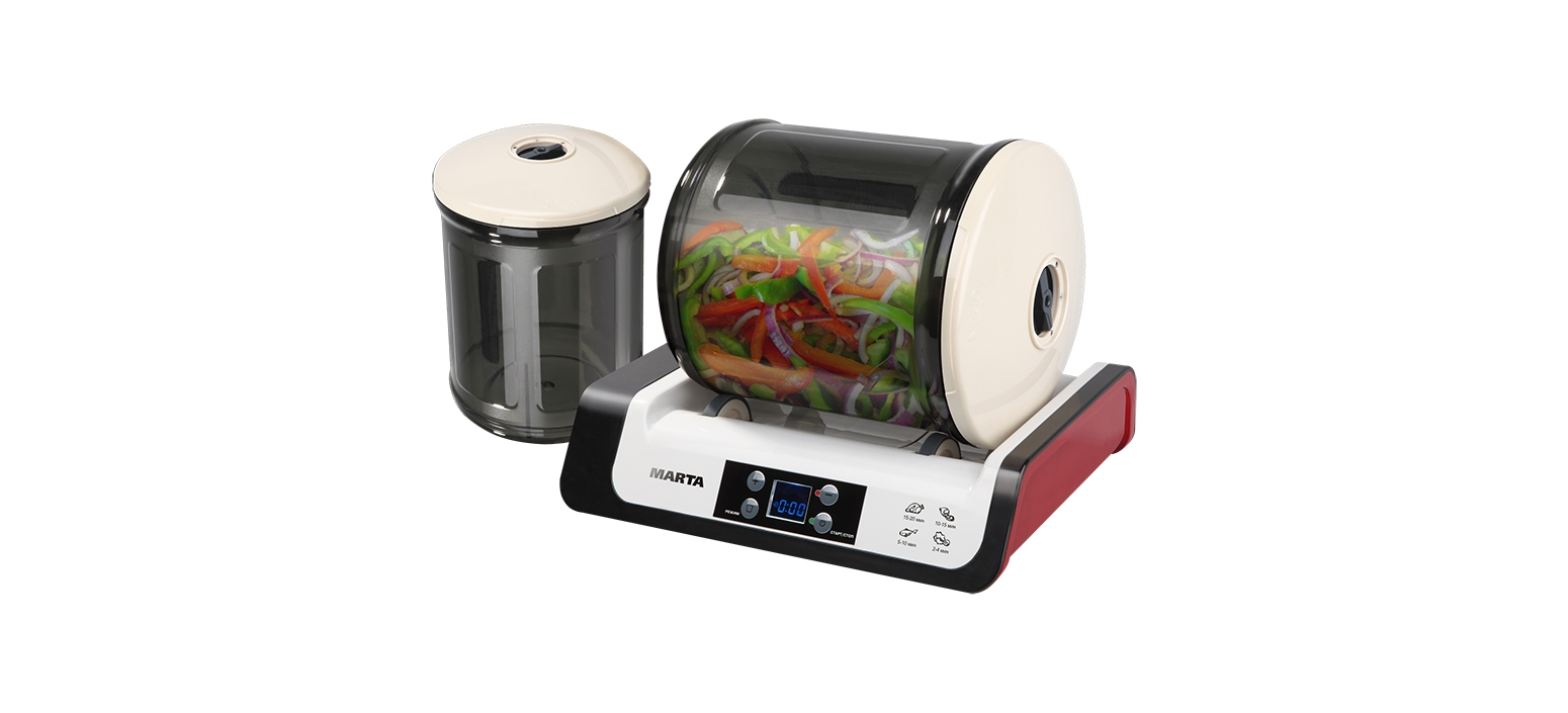 Благодаря работе автоматического вакуумного насоса и вращению емкости с продуктами маринатор позволяет замариновать мясо всего за 10 минут.