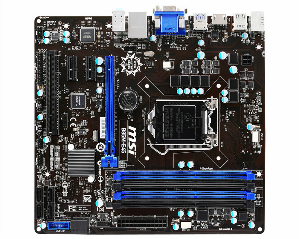 MSI B85M-E45. Поддерживаемые типы памяти: DDR3-SDRAM, Тип слотов памяти: DIMM, Поддерживаемые частоты памяти: 1066,1333,1600 МГц. Семейство процессоров: Intel, Совместимые серии процессоров: Celeron,Core i3,Core i5,Core i7,Pentium, Сокет процессора: LGA 1150 (Socket H3). Поддерживаемые интерфейсы носителя: Serial ATA II, Serial ATA III. Контроллер LAN: Realtek RTL8111G, Тип Ethernet интерфейса: Gigabit Ethernet. Комплектующие для: ПК, Семейство чипсета материнской платы: Intel, Чипсет материнской платы: Intel B85